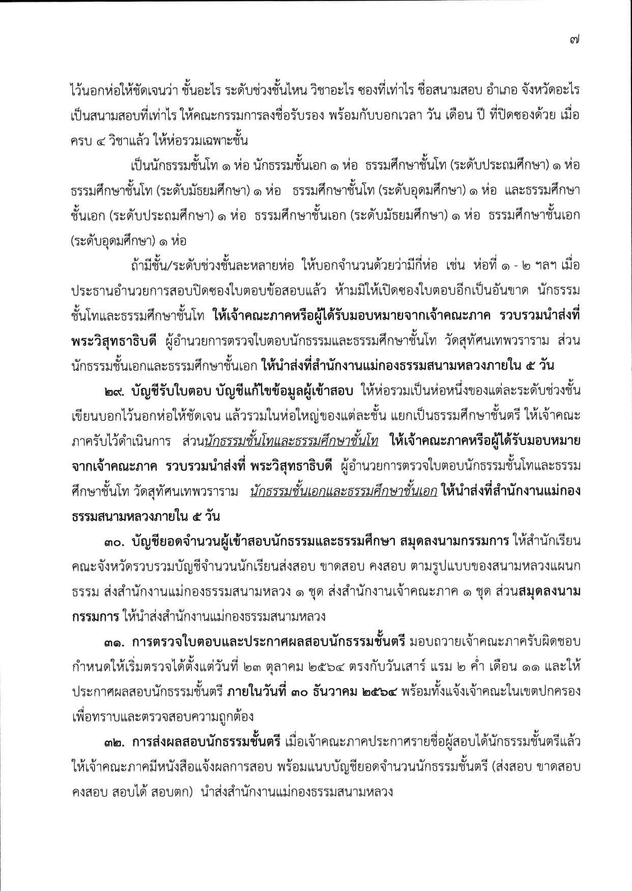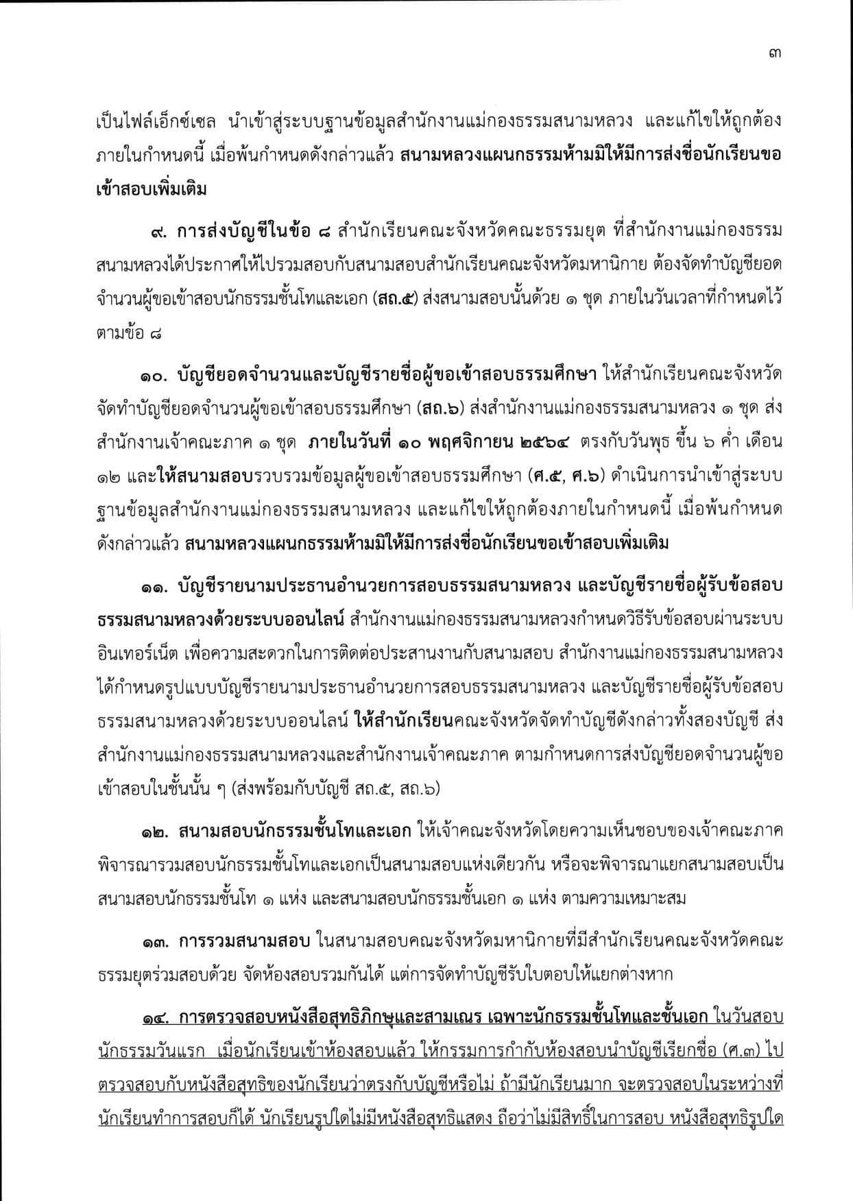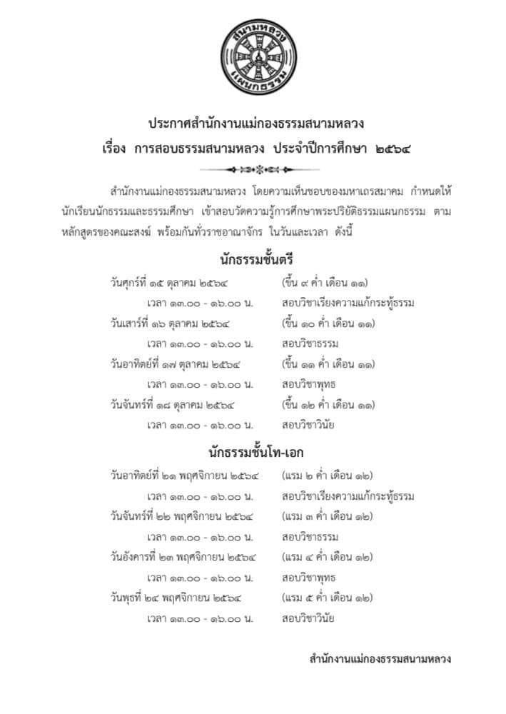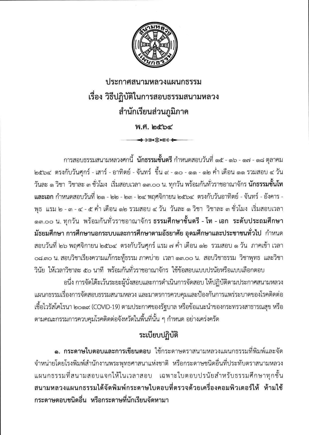 ประกาศสนามหลวงแผนกธรรม เรื่อง วิธีปฏิบัติในการสอบธรรมสนามหลวง สำนักเรียนส่วนภูมิภาค พ.ศ.๒๕๖๔