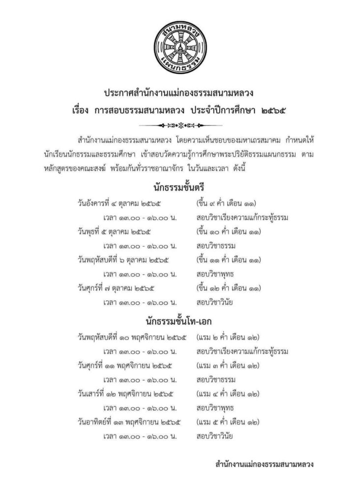กำหนดการสอบธรรมสนามหลวง ประจำปีการศึกษา ๒๕๖๕